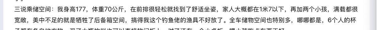 第二位车主是增购车辆,由于有了二孩,所以考虑买6座或者7座SUV,看了蔚来、理想、比亚迪等品牌的车型,要么就因为价格放弃,要么因为不合适的座椅布局放弃,而后关注到零跑C16,不到20万可以买大空间6座,有增程还有纯电,最终选择了增程版车型。根据车主反馈,身高175cm的他,不管是驾驶位置还是第三排的空间都很充裕,后备厢也可以正常满足放2个行李箱,家里有2个孩子坐在二排非常舒服,后期即便带着家里老人和两个孩子,全家6人出行,空间也绰绰有余。而且车辆的安全性不错,车速缓慢路过障碍物时,会自动打开全景影像,对于盲区可以很好的观察。